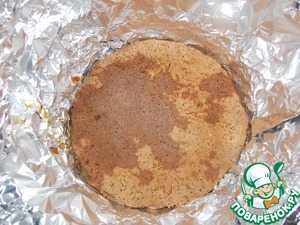 Затем взяла удобную миску, обложила изнутри ее фольгой и сделала бортики из фольги.. Положила туда бисквит.. Затем 2 чайные ложки растворимого кофе развела в небольшом количестве воды..