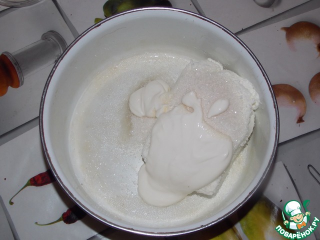 Затем делаем первый крем "творожный" 1 пачка творога-200 г, 6 чайных ложек сахара и 1 пакетик ванильного сахара и 100г сметаны.