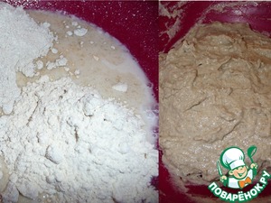 В набухшие дрожжи добавить 4 ст. л. ржаной муки и 2 ст. л. темной пшеничной, завести опару. Миску плотно закрыть крышкой и поставить в теплое место на 1,5 часа. (можно использовать микроволновку, запустить ее с полным стаканом воды на 1 мин., отключить и поместить миску во внутрь или разогреть духовку на 50С, отключить и поместить миску).
