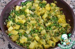 3. Разогреть масло в сковороде и добавить зерна горчицы. Прогреть несколько секунд, а когда они начнут лопаться, добавить лук и обжарить до золотого цвета. Добавить чили, куркуму, имбирь и соль и готовить еще 3 минуты. Добавить горошек, прогреть 2 минуты, а затем всыпать кубики картофеля и кинзу и хорошо размешать. Готовить еще 1-2 минуты, влить лимонный сок и немного остудить.