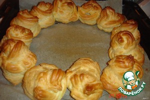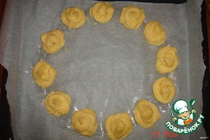 На противень, выстеленный пергаментом, отсадить по кругу 12 розеток, на небольшом расстоянии друг от друга.