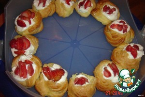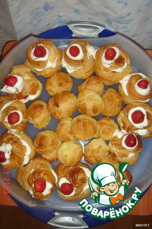 Срезаем верхушки наших эклерчиков, даем остыть и наполняем обе половинки кремом. В каждую корзинку выкладываем по нарезанной ягодке и накрываем срезанными шапочками наши пироженки.