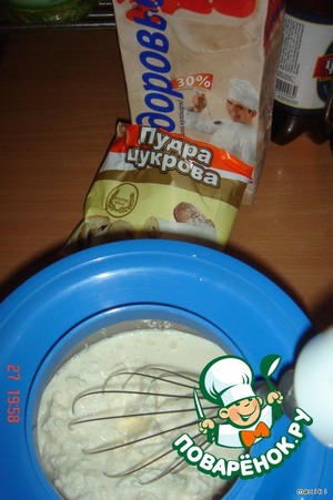 Тем временем взбиваем сливки с сахарной пудрой (я не удержалась и добавила в уже готовый крем ванильную сырковую массу, где-то 1:2).