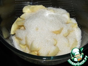 Очищенные и нарезанные яблоки поместить с стеклянную форму для микроволновки и засыпать сахаром. В микроволновку на 5 минут при мощности 900 Вт 100%.