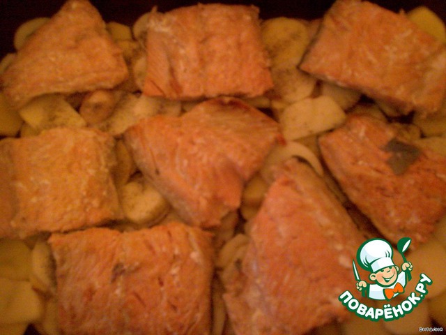 Поверх картофеля выложить обжаренную горбушу.