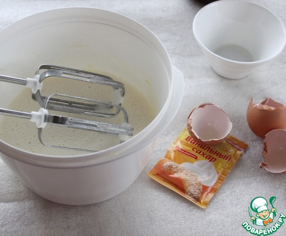 Сахар, ванильный сахар, яйцо, щепотку соли взбить миксером.