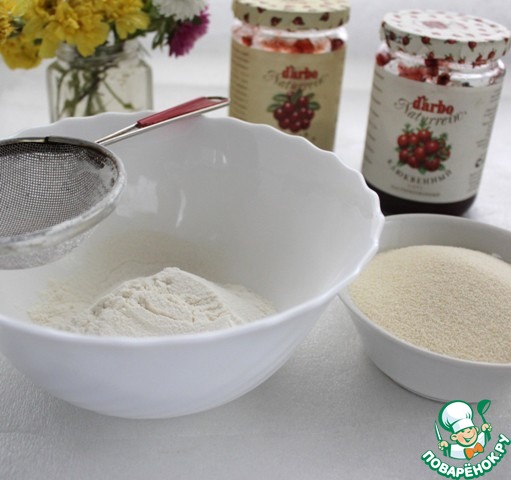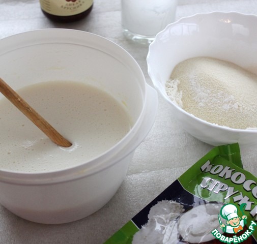 Просеять муку с разрыхлителем и смешать с манной крупой, соединить с жидкими компонентами, размешать. Тесто получается по консистенции как сметана