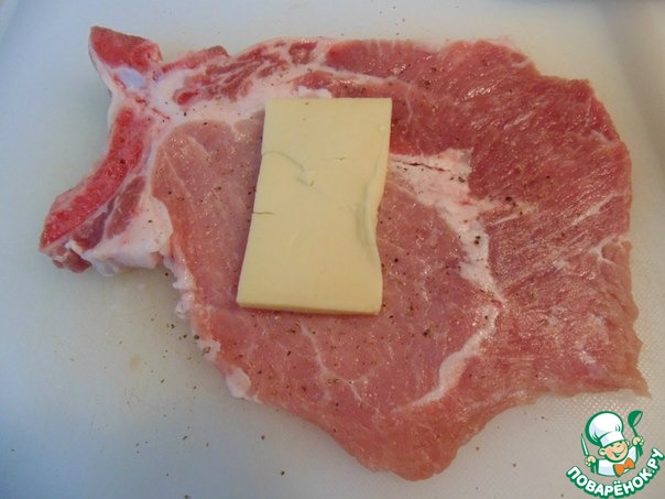 Мясо помыть, обсушить бумажными полотенцами. Отбить с двух сторон плоской стороной молоточка, важно не порвать мясо, чтобы сыр при обжарке не вытек. Посолить и поперчить.