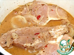 Режем крупными кусками поперек волокон и маринуем (лук, специи, пиво) перемешиваем и оставляем на 12 часов.