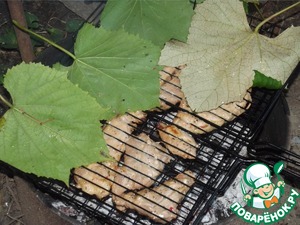 Накрываем нашу решетку вымытыми листьями винограда. 2,3,4 раза - это не только придает мясу неповторимый аромат, но и позволяет прожариться на 100% и делает мясо более мягким и сочным.