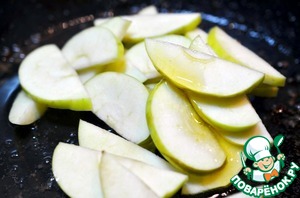 В сковороду, где жарилась печень, добавить сливочное масло, яблоки, нарезанные дольками.