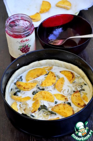 Вылить заливку на тесто, выложить луково-шпинатную смесь и жареную тыкву. Выпекать при 180* 15 минут.