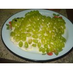 Весь купол промазать тонким слоем свежего майонеза и украсить зернами граната и зеленым горошком.