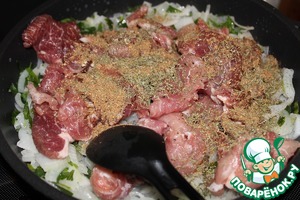 Добавляем нагрев, кладем свинину и специи (тмин, кориандр, перец), обжариваем, помешивая, пока мясо не поменяет цвет, солим. Затем вливаем куриный бульон и тушим под крышкой 45 - 60 минут. Если есть желание, то предпочтительнее потушить мясо в духовке.
