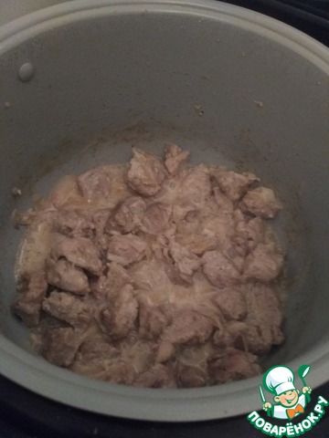 Мясо нарезаем на кусочки примерно 3х3 см и выкладываем в посуду для приготовления блюда.