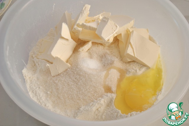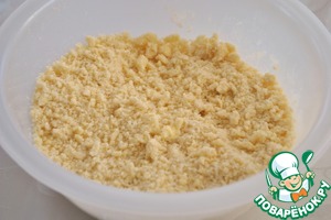 К смеси добавляем 200г. холодного сливочного масла или маргарина и руками растераем до образования крошек. И лучше убрать в холодильник, до тех пор пока не дойдет до них очередь.