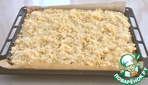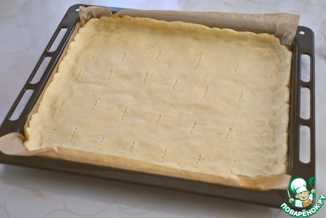 Тесто охладилось. Берем противень, у меня он 30 х 36, да пирог будет большой! Застилаем пергаментом и распределяем тесто по всей поверхности, формируя бортики, наколоть тесто вилкой.