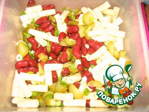 1. Если нет дома зелени, то можно добавить обжаренный репчатый лук и шампиньоны, которые тоже привнесут в этот салатик свою пикантность.