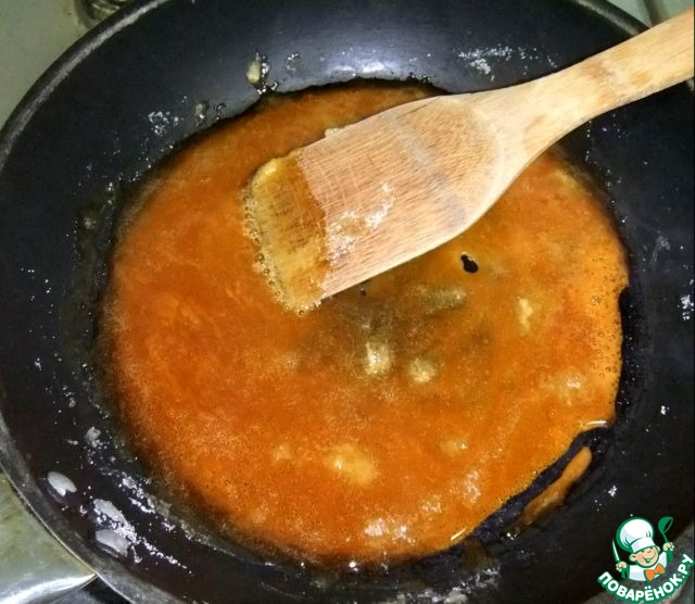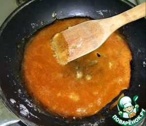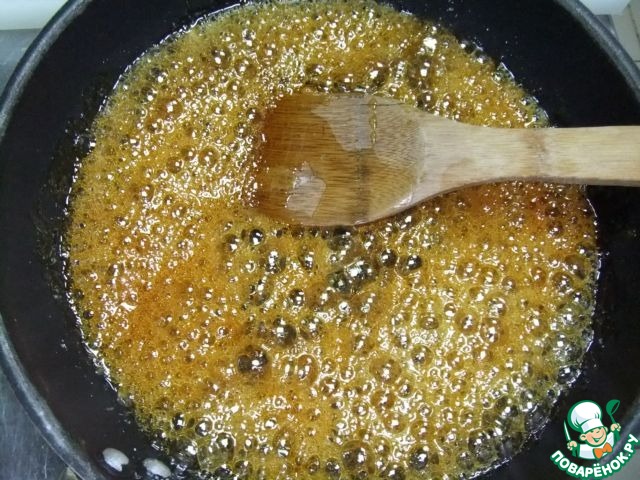Высыпать сахар на сухую сковороду. Нагревать до его карамелизации.