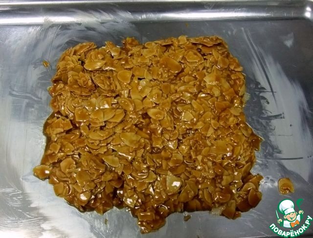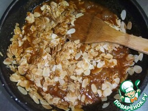 Снять сковороду с огня и всыпать лепестки миндаля. Перемешать до однородной массы.
