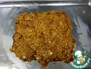 Выложить массу в виде квадрата. Когда слегка остынет, перевернуть и порезать на кусочки. Дать полностью застыть.