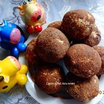 Теперь делим на шесть частей творожную массу и начинаем делать пирожное, в середину кладем по черносливу, формируем в виде картошин и обваливаем в кокосовой стружке - пирожное готово, а вот петрушкой просто украсила.