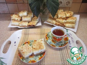 Это очень нежный творожный пирог, с персиковой прослойкой. Сверху посыпан миндальными лепестками.