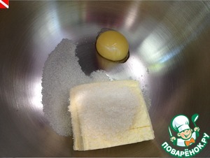 Начнем с теста. Тесто можно сказать обычное, песочное. В комбайне смешиваем размягченное сливочное масло, сахар и желток.