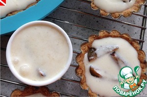 Застилаем тесто пергаметом, насыпаем фасоль (рис и т. п.) и выпекаем 10-15 минут. Затем убираем груз и пергамент и выпекаем еще 5-7 минут. Даем основе остыть. Смазываем ее соусом.