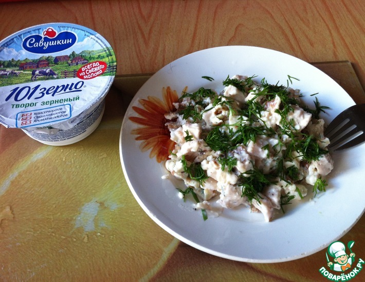 6. Делаем заправку: творог смешать с йогуртом, добавить чеснок, соль, перец.