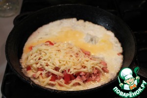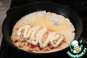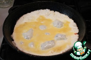 На разогретую сковороду (естественно с маслом) вылить треть взбитых яиц, распределить по всей площади сковороды.
