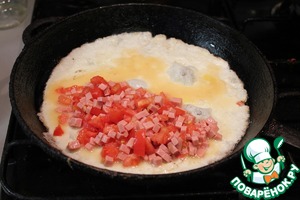 На одну половину, яичного блинчика выложить треть томатов с колбасой.