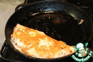 Подхватить лопаткой свободную половину омлетного блинчика и накрыть ей начинку, слегка придавив сверху.