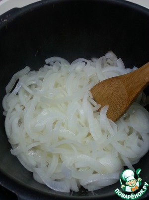 Обжарить на сильном огне до золотистого цвета, в предварительно нагретом масле. Я обжаривала в мультиварке, процесс занял у меня 4 мин. И в мультиварке, и на плите лук необходимо часто помешивать, дабы избежать пригорания.