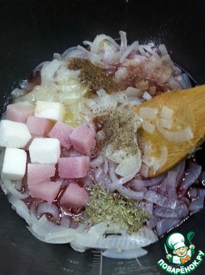 Добавляем все другие ингредиенты. Красное вино, сахар, мёд, уксус, кориандр, тимьян, корицу, шалфей, соль и перец.