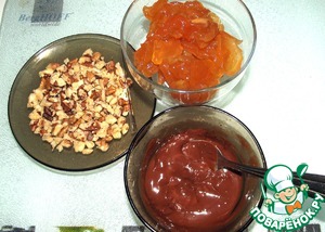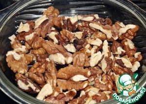 Очищенные грецкие орехи на 2 минуты в микроволновку при полной мощности, затем руками поломать на крупные кусочки (можно прокатать в пакете скалкой)