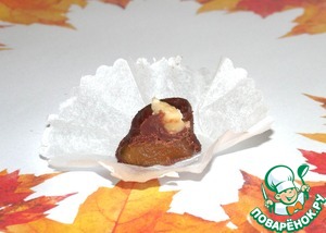 Кусочек уже готового яблока обмакнуть в шоколад, затем орехи и выложить на покрытую пленкой твердую поверхность. На час в холодильник. Наш шедевр готов!
