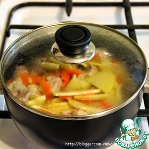 В высокой кастрюли с антипригарным покрытием растопим сливочное масло и быстро подрумяним на нем мясо. Добавим картофель, морковь и лук. И еще немного пожарим. Не забываем постоянно мешать!