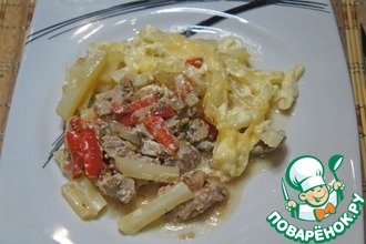 • Далее в форму для выпечки выкладываем мясо со сковороды и произвольно выкладываем наш гарнир. Отправляем в разогретую до 200 градусов духовку на 35-40 минут.