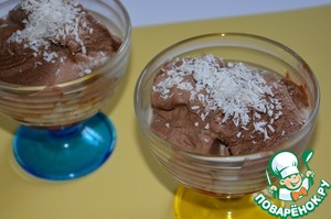 Кокосовый ликер смешать с шоколадом, натертым на мелкой терке, и горсткой кокосовой стружки.