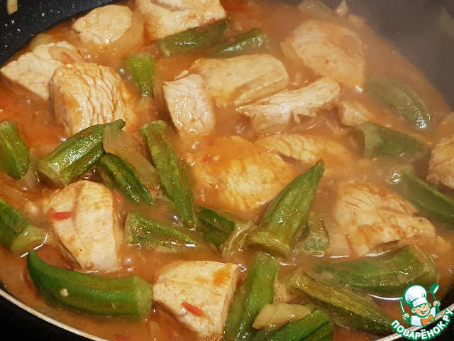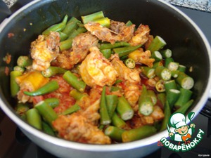 (плоды бамии тушатся приблизительно 30 мин), тушить блюдо до готовности, мясо должно с легкостью отделяться от костей, но не разваливаться на тарелке.