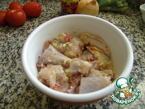 Вымыть курицу, обсушить, нарезать на мелкие порционные кусочки, посолить, поперчить (для этого перчики предварительно растолочь в ступке), заправить мелко нарезанным чесноком, полить соком лимона.