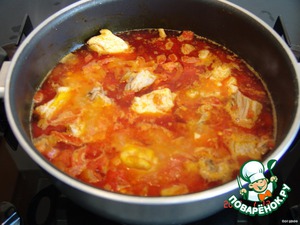 Далее с луком обжарить немного кусочки курицы, добавить нарезанные мелкими кубиками помидоры, лавровый лист, накрыть крышкой и тушить не менее 1 часа.