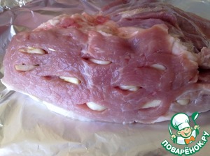Форму для запекания застелить фольгой. Мясо промыть и хорошо обсушить. Выложить окорок в форму на фольгу жиром вниз. Чеснок очистить и нарезать на кусочки. На мясе сделать небольшие надрезы, нашпиговать окорок со всех сторон чесноком.