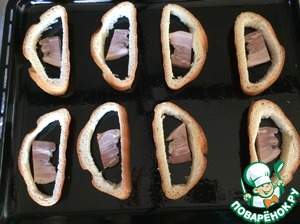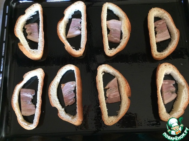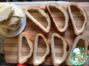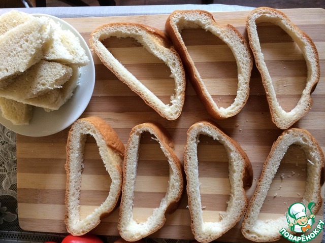 Далее аккуратно вырезаем серединку с каждого ломтика хлеба.