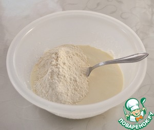 В муку добавить разрыхлитель, просеять и смешать с творожной массой. -