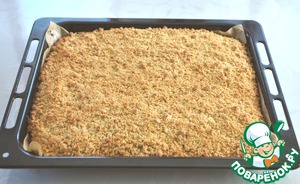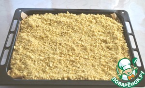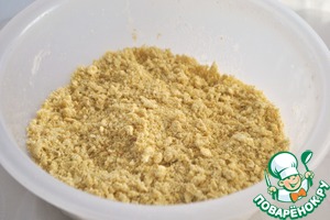 Для приготовления верхнего слоя просеять муку и перемешать с фисташковой мукой, сахаром, желтком. Добавить нарезанное кусочками масло. Перетереть массу руками или с помощью двух вилок до состояния, похожего на хлебные крошки.