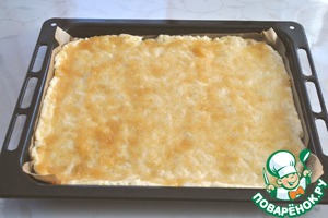 Распределить тесто на противне (30 х 36 см). Смазать подогретым джемом, в оригинале рецепта джем апельсиновый. У меня джем яблочный с лимоном и имбирем по рецепту с нашего сайта. Подогреваем джем для того, что бы он легко распределялся по тесту.