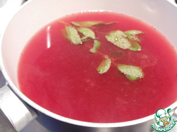Добавить мяту, проварить 5 минут. Процедить, хорошо отжать жмых, вернуть на огонь, добавить сахар, перемешать.