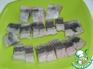 Разделать сельдь и разрезать её на кусочки.